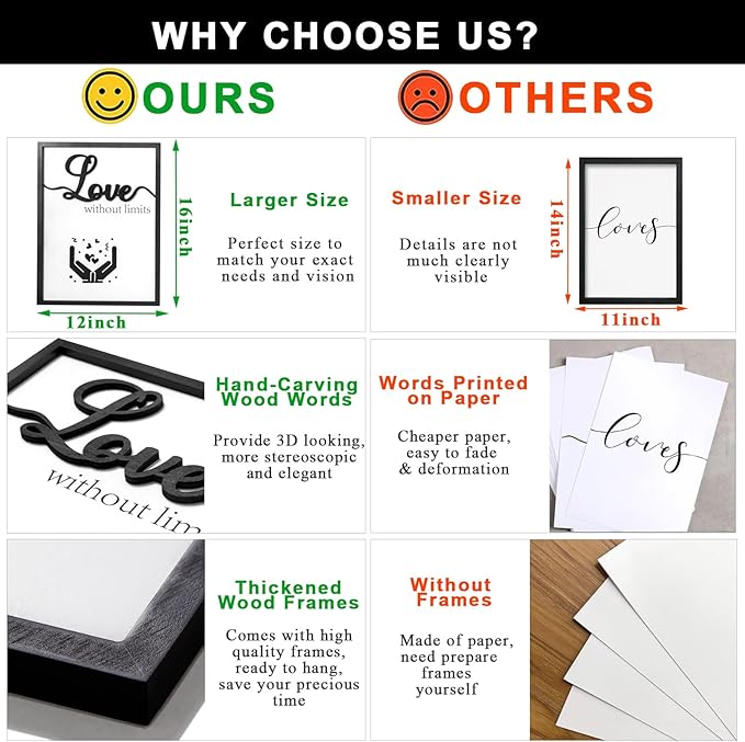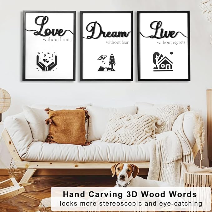 - 【Hand Carving 3D Wood Sign】Unlike other cheaper paper print words, our bedroom wall decor inlaid with 3d hand-carving wood words [Love], [Dream], [Live], that makes the living room wall art looks more stereoscopic and eye-catching. The 3D motivational wall decor gives your room an instant make-over, promotes your taste and texture of daily life, it helps you get a lot of compliments.