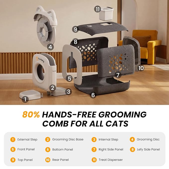 - 【Treat dispenser & grooming record 】Scan the QR Code to Access Cat Entry Data: The treat dispenser base is equipped with sensors that track each cat’s entry and record grooming frequency, giving you easy access to detailed statistics.