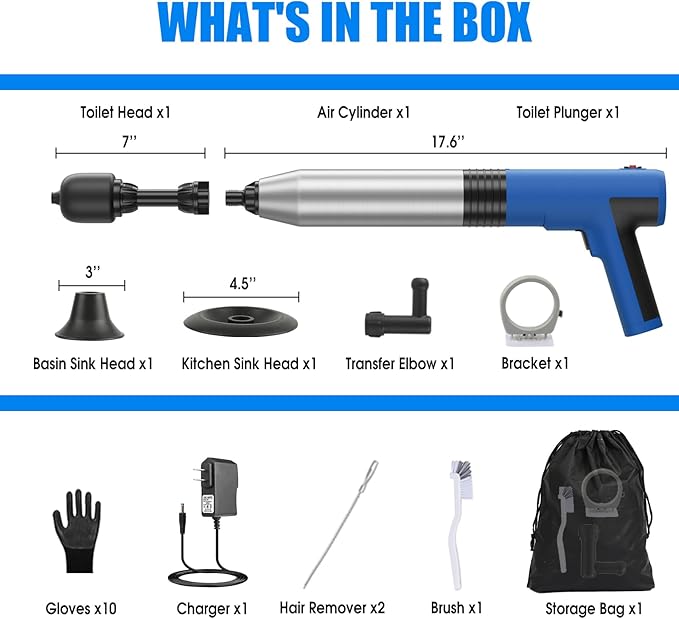 - ✅[20 Pcs Electric Toilet Plunger Set] - Unlike traditional plungers for bathroom, GEGATE all-in-one electric toilet plunger kit includes: Toilet Plunger x1, Toilet Head x1, Basin Sink Head x1, Kitchen Sink Head x1, Transfer Elbow x1, Gloves x10, Hair Remover x2, Cleaning Brush x1, Storage Bag x1, and Wall Bracket x1. It's the most complete toilet clog remover set—perfect for every drain in your home.
