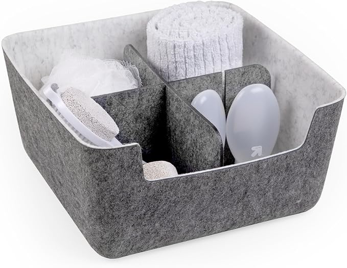 - Protective & Soft: Felt material safeguards contents and adds a warm aesthetic to your space. Interior walls in small and medium bins are adjustable and allow bins to stack.