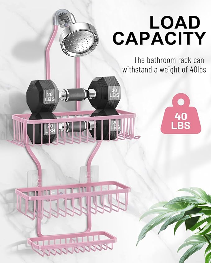 Pink Shower Caddy for Bathroom - Never Rust Hanging Shower Organizer with Soap Basket and Hooks - Large Capacity 3 Tier Aluminum Over The Showerhead Caddy