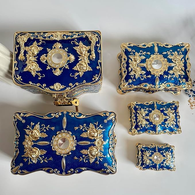 Truewon Jewelry Chest Rose Pastoral Style Metal Box Trinket Vintage Trinket Gemstone Storage Tray Treasure Souvenir Gift Case for Girls Women (Golden Blue, Extra Large)