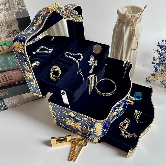Truewon Jewelry Chest Rose Pastoral Style Metal Box Trinket Vintage Trinket Gemstone Storage Tray Treasure Souvenir Gift Case for Girls Women (Golden Blue, Double Extra Large Hand-held)