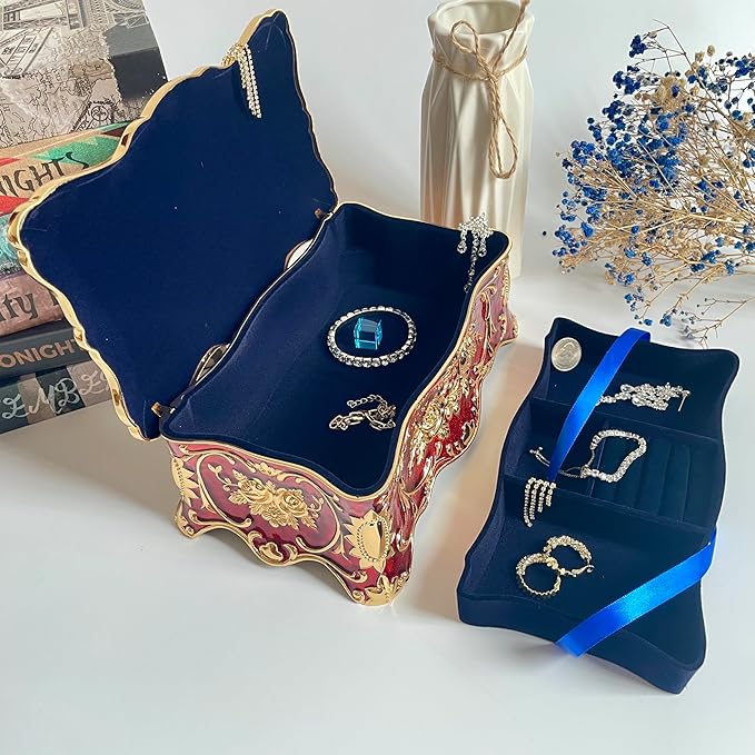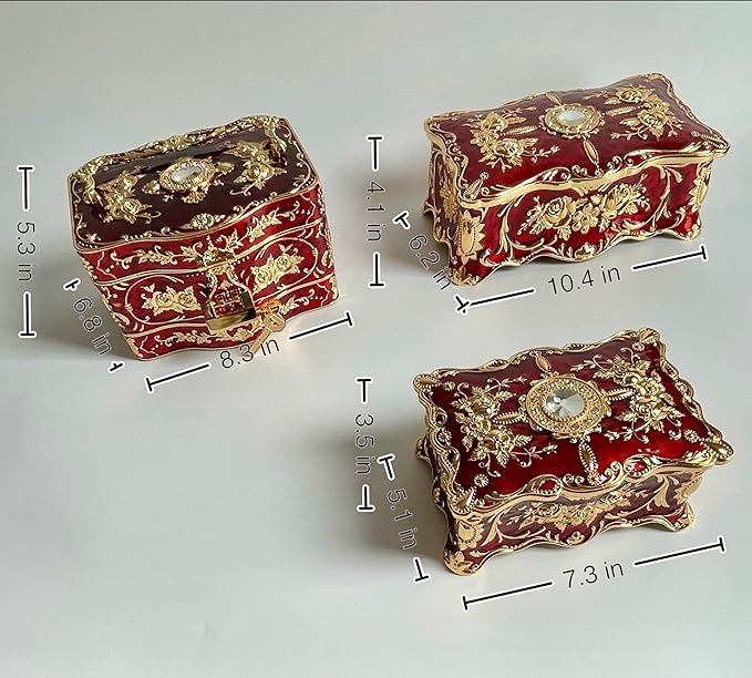 Truewon Jewelry Chest Rose Pastoral Style Metal Box Trinket Vintage Trinket Gemstone Storage Tray Treasure Souvenir Gift Case for Girls Women (Golden Red, Extra Large)