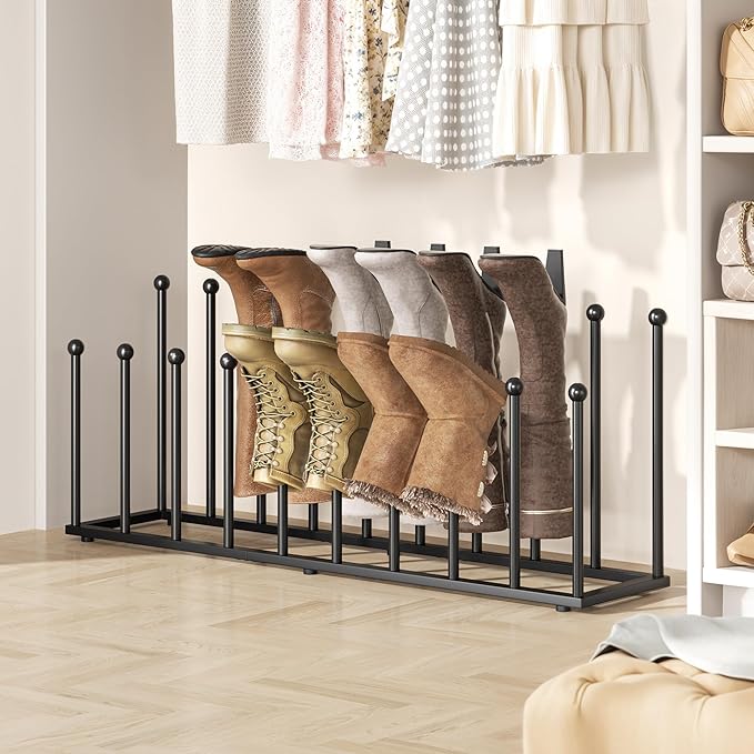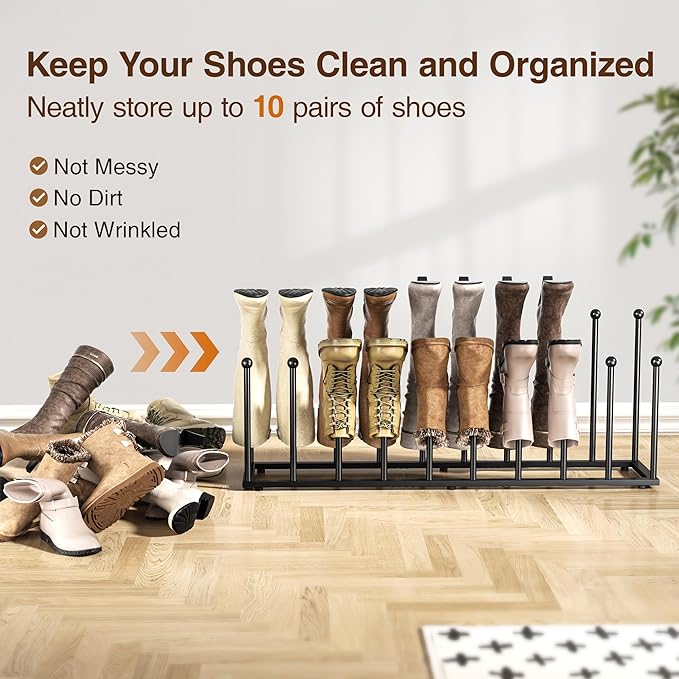 - Free Standing Boot Racks for 10 Pairs Boots: This shoe rack has 20 metal rods and a rectangular base, which can stably hold 10 pairs of boots of different shapes, such as high-top knee boots, hiking boots, cycling boots, rain boots or work boots, etc. It can provide a comfortable home for your different styles of boots while saving so much your space.