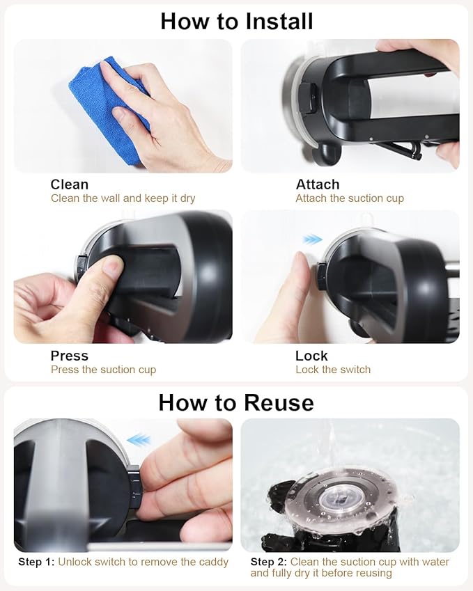- šEasy Install & Reusable Design: Why waste hours scraping glue and risk wall damage? The JOTPE suction cup shower caddy installs and removes in secondsāAttach & Press & Lock, and simply unlock the switch to remove it. No drilling, screws, holes, glue, or tools are needed.