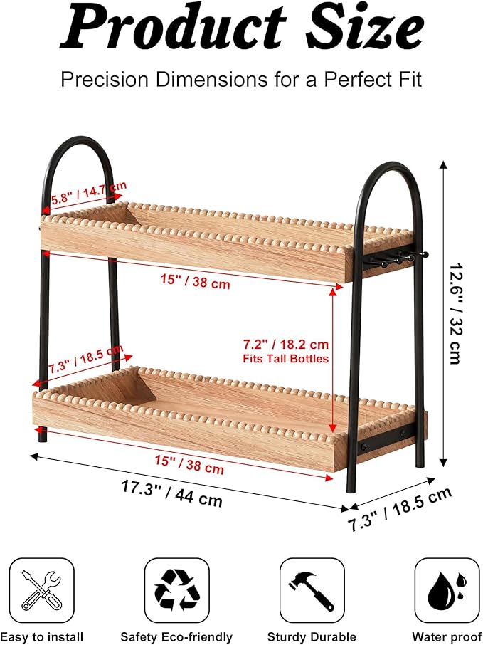- Spacious 2-Tier + Jewelry Hooks - Our extra-large makeup organizer has two tiers and 8 jewelry hooks, storing over 20 perfume bottles and skincare items. The overall dimensions with hooks are 17.3"L x 7.3"W x 12.6"H, and without hooks, it's 15"L x 7.3"W x 12.6"H. The distance between shelves is 7.2" (18.2 cm), perfect for tall bottles. Ideal for bathroom and vanity countertops. This bathroom counter organizer and perfume organizer keeps your makeup organizer countertop neat
