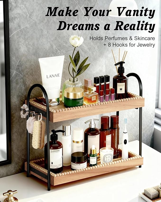 2-Tier Perfume & Makeup Organizer with 8 Jewelry Hooks, Eco-Coated Paulownia Wood Vanity Tray for Bathroom, Coffee Bar & Dresser - Large Storage Shelf for Skincare Bottles (Light Brown & Black)