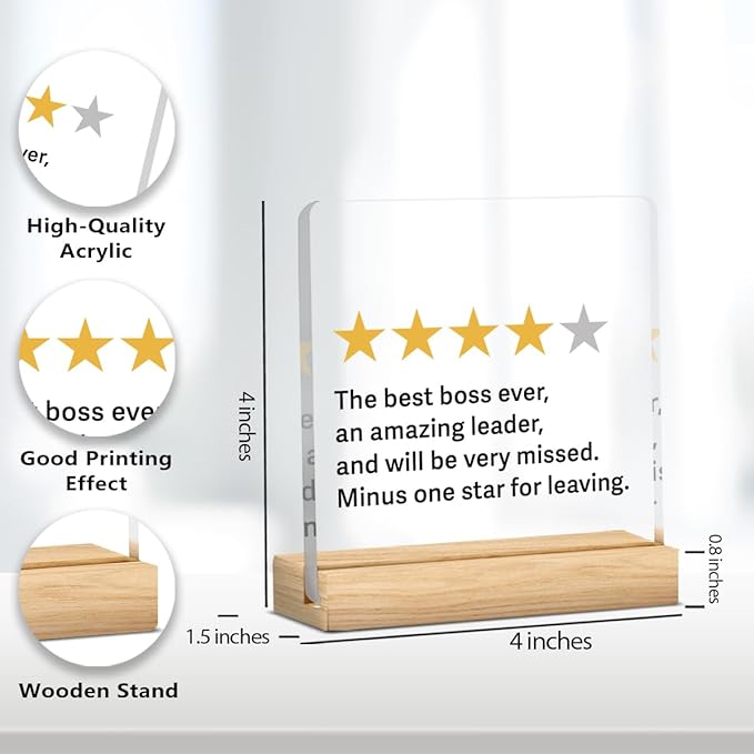 - 【Decorative properties】 This 4x4 inch Acrylic appreciation plaque is the perfect way to honor your best boss ever or esteemed mentor. The crystal-clear acrylic paired with a rustic wooden base creates a sophisticated plaque of appreciation that radiates professionalism and gratitude, making it ideal for office displays or desk decor in executive suites.