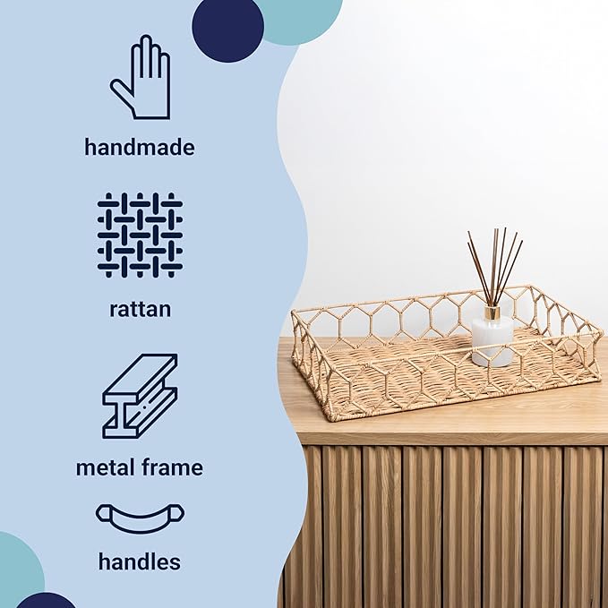 - Organize loose items in your home with our honeycomb patterned handwoven tray. Whether placed on a coffee table or dresser, this tray is the perfect addition to any bohemian or coastal home. With it's robust rattan weaving, the sturdiness of the tray makes it easy to move between rooms as you please.