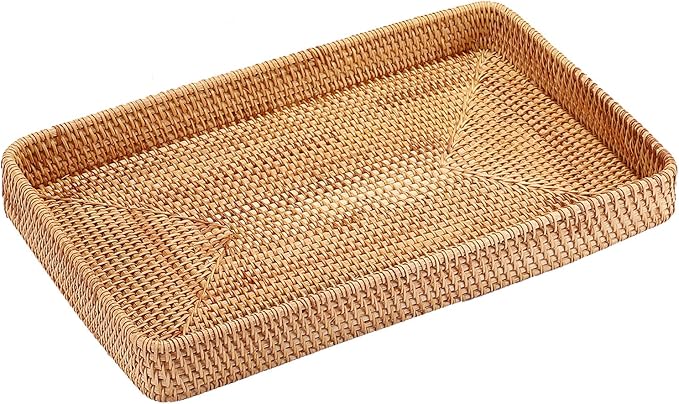 Hipiwe Rattan Serving Tray Large Wicker Storage Basket Tray for Organizing Rectangular Decorative Woven Trays Snacks Fruit Wicker Basket for Coffee Table Bathroom Home Decor,14.8"x 9.0"x1.8"
