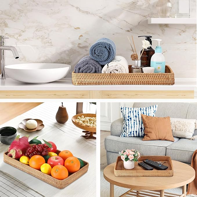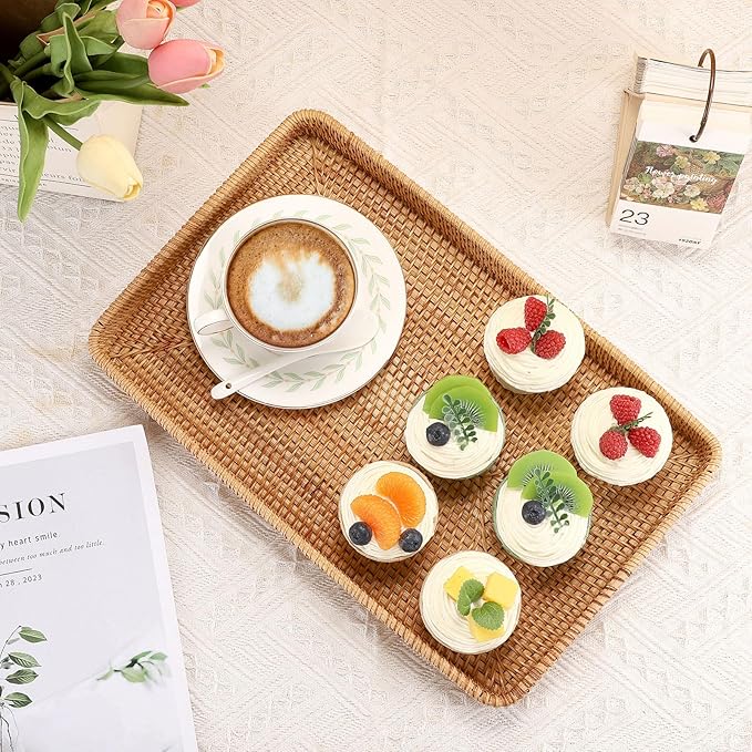 - Keep Desktop Clean and Tidy: This woven tray basket is perfect for everyday storage. Use it to hold items for the living room, bedroom or kitchen, perfect for serving food, drinks, coffee, tea, water, wine, cake, dessert, snacks, dry fruit, etc. Also can hold flower, remote control, phone, keys and other items and keep them in one place with this rattan tray