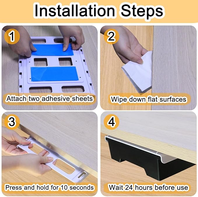 - 【Easy to Install】: Under table storages are two mounting options available. 1: Use the included nano adhesive tape to stick it to any smooth surface without drilling, such as desk, tables, cabinets, dressers, bookshelves, wardrobes, etc.s 2: Use the included screws to fix for more firmness. To ensure the drawer is secure, wait 24 hours before using it.