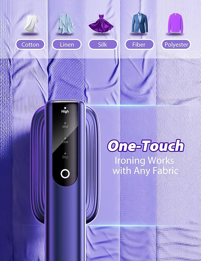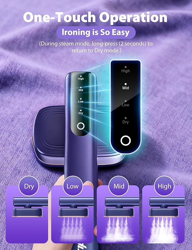 - 【Touch Control · Three Steam Settings】Touch buttons effortlessly adjust three steam intensity levels for continuous, efficient steam output that quickly removes wrinkles. Customize steam strength for different fabrics—ideal for eliminating creases in silk, lace, tulle, cotton, linen, nylon, denim, wool, and more—saving ironing time.