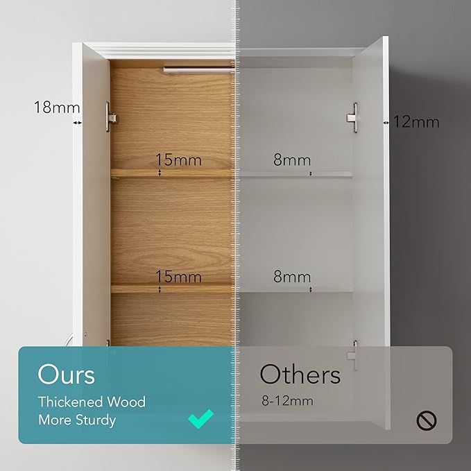 - 【High-Quality Materials】Crafted from durable MDF, the wall cabinet above the toilet features 0.6–0.7 inch thick panels for enhanced sturdiness compared to other brands. Its waterproof and moisture-resistant painted finish ensures durability in humid bathroom conditions. The soft-closing hinges prevent damage from slamming and have undergone anti-corrosion and rust-resistant testing.