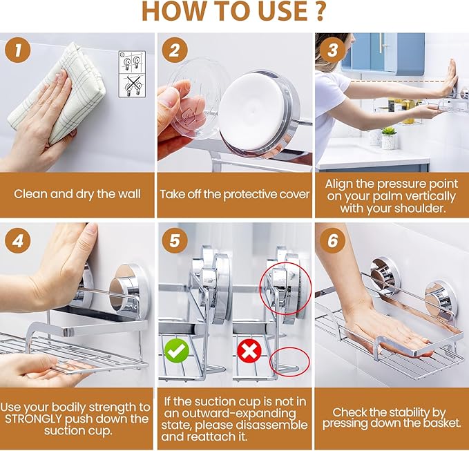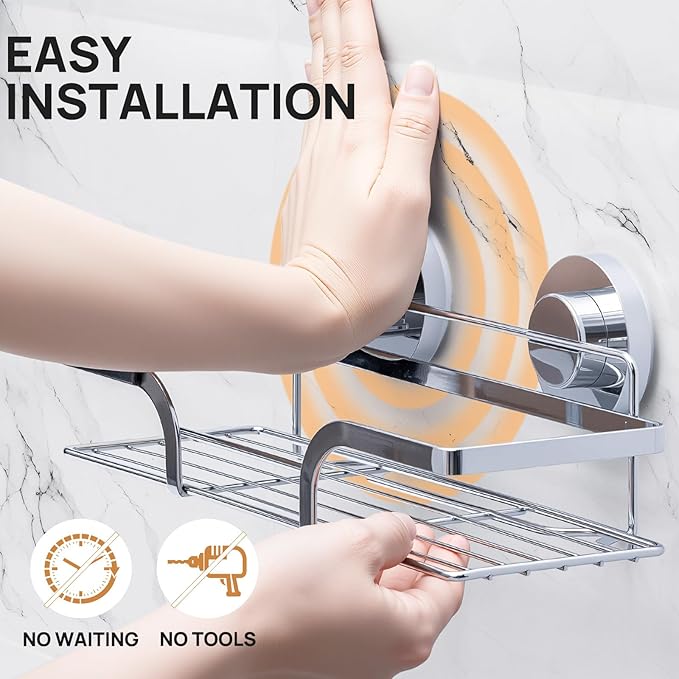 - Easy Installation & Remove: No drilling, no glue, no tools, and no waiting required to use the shower rack. Simply choose a smooth and dry surface without any grout, take off the protective cover and push the board "PUSH" STRONGLY until you hear "PUFF", ONE second to complete the installation. The suction cup is removable without leaving any marks, so you can adjust installation position whenever you want