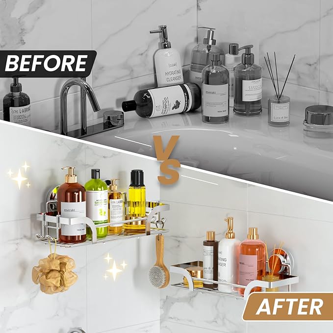 - Large Capacity & Humanized Hook: Large capacity for shampoo, shower gel, cosmetics, hair conditioner, hand washing liquid and so on. Also shower basket includes 2 large size hooks, you can hand your razors, towels, brushes on it. The shower holder organizer works great in the shower/ bathroom/ bathtub/ kitchen/RV and more, which is enough bathroom accessory storage even for a big family