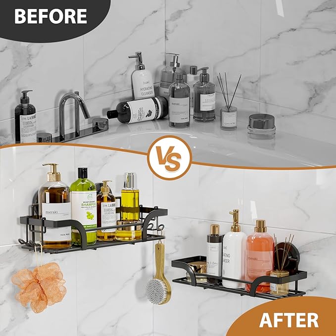 - Large Capacity & Humanized Hook: Large capacity for shampoo, shower gel, cosmetics, hair conditioner, hand washing liquid and so on. Also shower basket includes 2 large size hooks, you can hand your razors, towels, brushes on it. The shower holder organizer works great in the shower/ bathroom/ bathtub/ kitchen/RV and more, which is enough bathroom accessory storage even for a big family