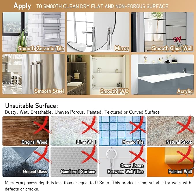 - Warn Tips: ONLY work for ceramic tile (uncracked), glass, mirror, polished metal, stainless steel and acrylic. Please don't stick to a grout line. NOT work for painted/dry wall, wood, wall paper or any other rough/crack wall. If problems when firstly installation, please wash the suction cup, dry it with hair dryer and test it on the smooth glass surface. If suction holds, that means initial wall might not applicable for using suction cup, please change installation location