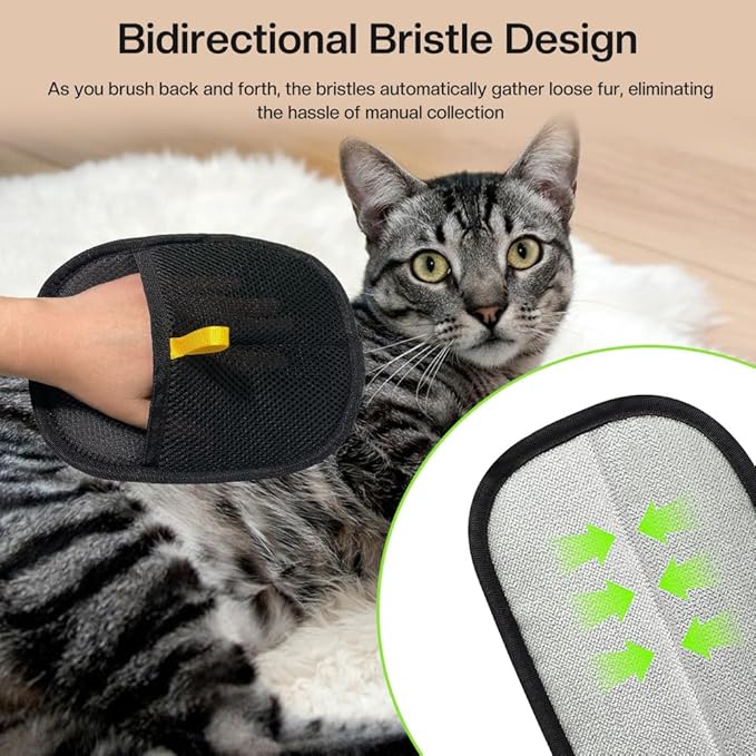 - Pet Hair Removal Solution: Tired of stubborn pet hair clinging to clothes and furniture? Our pet hair removal glove is your great cleaning assistant! Simply wear the glove and gently wipe surfaces to collect hair instantly. Perfect for quick cleanups on sofas, bedding, or clothing, it traps hair effectively without spreading mess. Stop worrying about excessive shedding - keep your home clean and reduce the risk of pets ingesting loose hair during grooming.