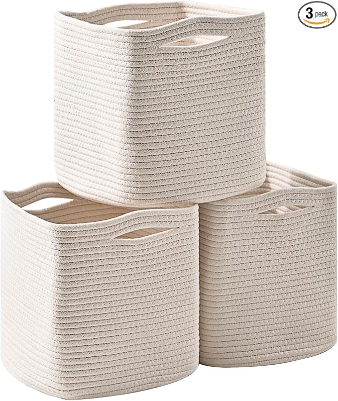 13 Inch Cube Closet Storage Bins, Woven Cotton Rope Organizer Baskets for Organizing & Shelves, Books, Towels, Clothes, Toys, 13x13x13 in, Off White (Pack of 3)