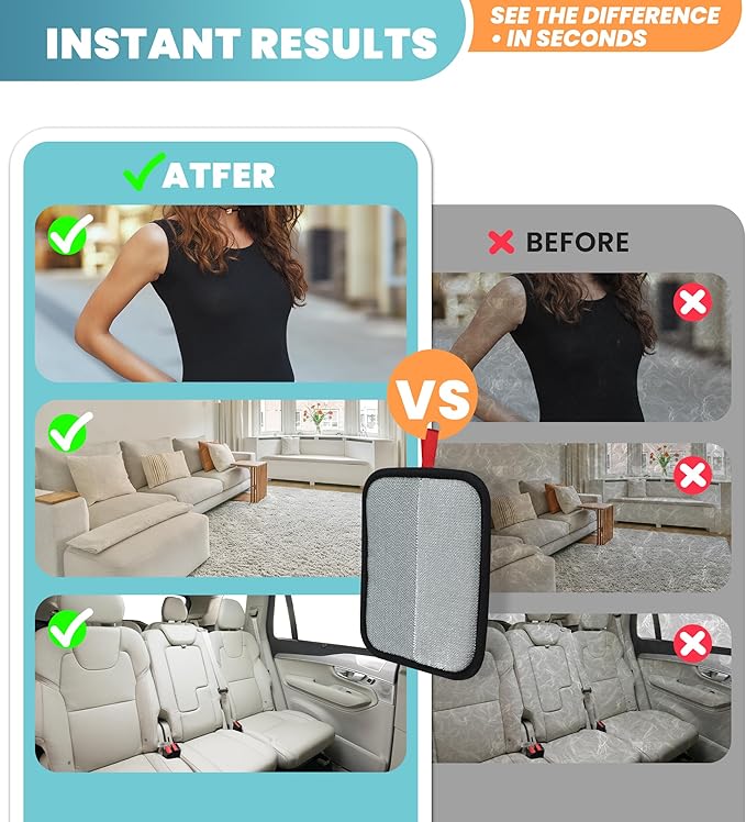 - Instant Hair & Lint Removal: Cleans pet hair, lint, and dander from clothes, couches, carpets, and car seats in seconds—just swipe for visibly hair‑free surfaces with no sticky residue or refills.