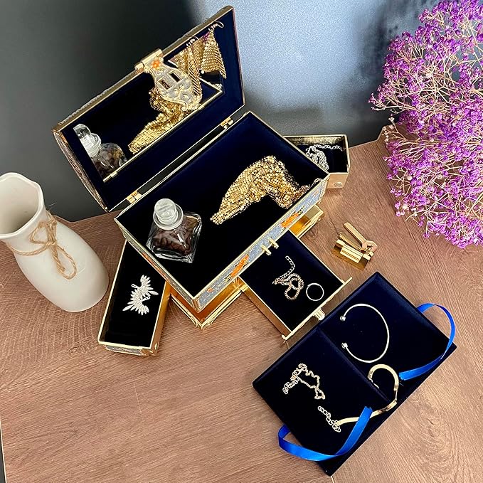 - Retro style,Rectangular cabinet, Arched top.Lined with velvet to avoid scratching your items.The surface of the electroplating and paint process.L and XL come with locks and keys.
