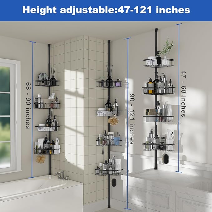 - Height Adjustable Shower Caddy Tension Pole: Floor to ceiling shower caddy cornor 47-121 inch design is not only used in various scenes, such as bathtubs, washbasins, showers, kitchens and RVs.The corner shower shelves can save space to the maximum extent