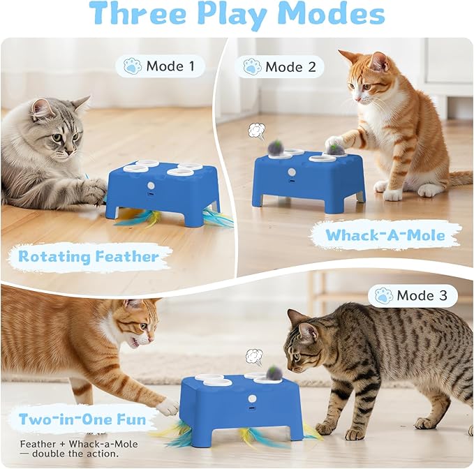 - [3-in-1 Multi-Play Design] Combines three engaging play modes — a spinning feather teaser, whack-a-mole hide-and-seek, or both at once — to satisfy cats hunting instincts and keep cats active and entertained indoors