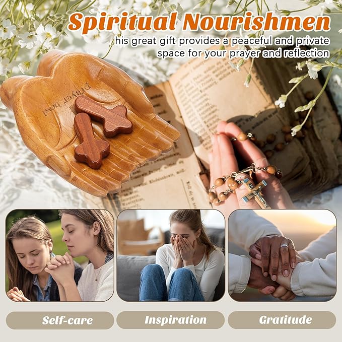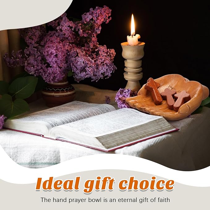- A Symbolic Centerpiece for Your Devotion: the hands shaped prayer bowl is designed to comfortably cradle in your palms or rest on a surface, symbolizing holding intentions in prayer; The set is complemented by five rustic, coffee toned wood hand held crosses; Together, they form a meaningful prayer decor collection for your home altar, bedside table, or living space, serving as a constant visual reminder of faith
