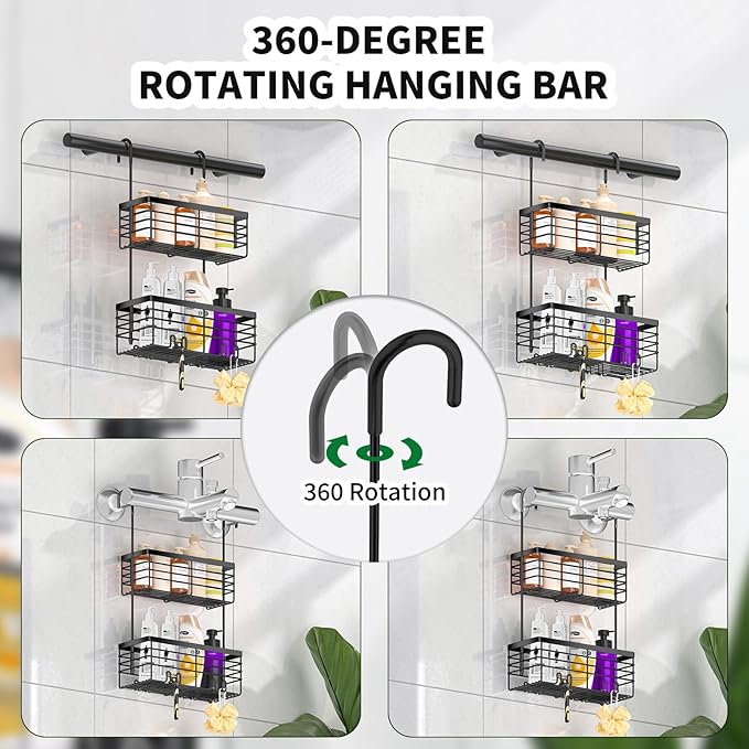 - Double-layer Shower Banging Basket:2x suction cups, 1x double layered shower caddy basket. The upgraded double-layer bathroom hanging caddy has a larger capacity and wider applicability. This 360-degree rotatable shower caddy can be hung on doors, showerheads, towel racks, or curtain rods. It perfectly stores body wash, shampoo, conditioner, facial cleanser, razor, sponge, and towels, making your bathing environment neater.