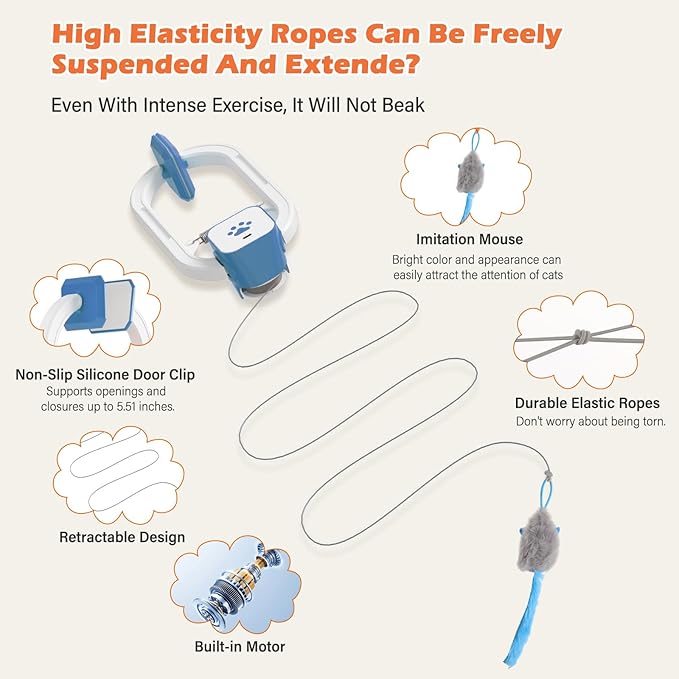 - Strengthen Your Bond with Easy Setup.No complicated assembly required! Easily hang it on any doorway in seconds. It's not just a toy; it's an opportunity for interactive fun between you and your pet. Use the fishing pole for controlled play sessions and create unforgettable bonding moments.