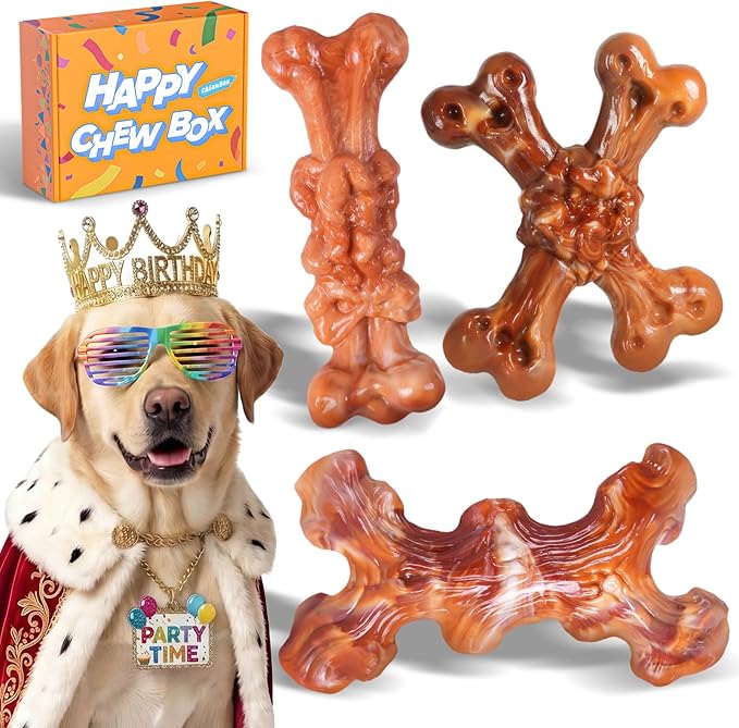 - 3 Pack Dog Toys, Doggies Approved: The indestructible dog toys come in a nice gift box with 3 different styles for dog birthday: Twisted Y-Bone, Cross Bone, Classic Bone. These dog toys for aggressive chewers are tough dog toys and made from durable material that actually lasts. The super chewer dog toys look very realistic and have a yummy bacon smell. Also, fun textures and colors of these chew toys for aggressive chewers make pups obsessed. You will be wowed by the attention to detail of these three chew toys for dogs when first opening the box, with a bit of confusion: are these dog chew toys actually real dog chew bones? Actually, they are not, but harder and safer pet toys for dogs.