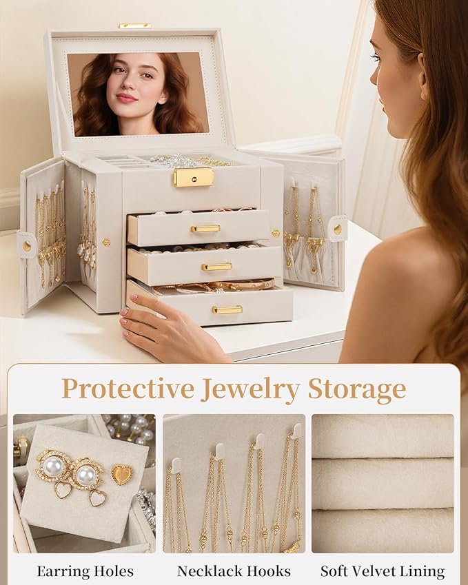 - 4 Layers, Large Capacity: This jewelry box with mirror has different storage space, 3 drawers, you can classify all jewelry and put them neatly. Such as rings, bracelets, earrings, brooches and other jewelry