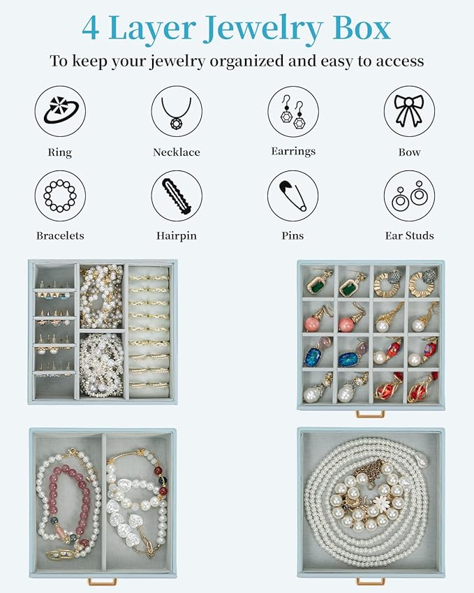 - 4 Layers, Large Capacity: This jewelry box with mirror has different storage space, 3 drawers, you can classify all jewelry and put them neatly. Such as rings, bracelets, earrings, brooches and other jewelry