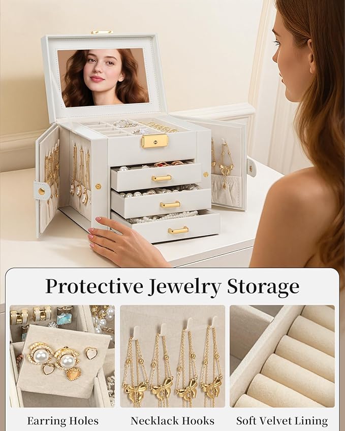 - 4 Layers, Large Capacity: This jewelry box with mirror has different storage space, 3 drawers, you can classify all jewelry and put them neatly. Such as rings, bracelets, earrings, brooches and other jewelry