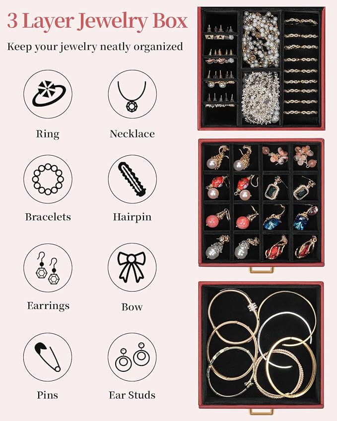 - 3 Layers, Large Capacity: This jewelry box with mirror has different storage space, 2 drawers, you can classify all jewelry and put them neatly. Such as rings, bracelets, earrings, brooches and other jewelry