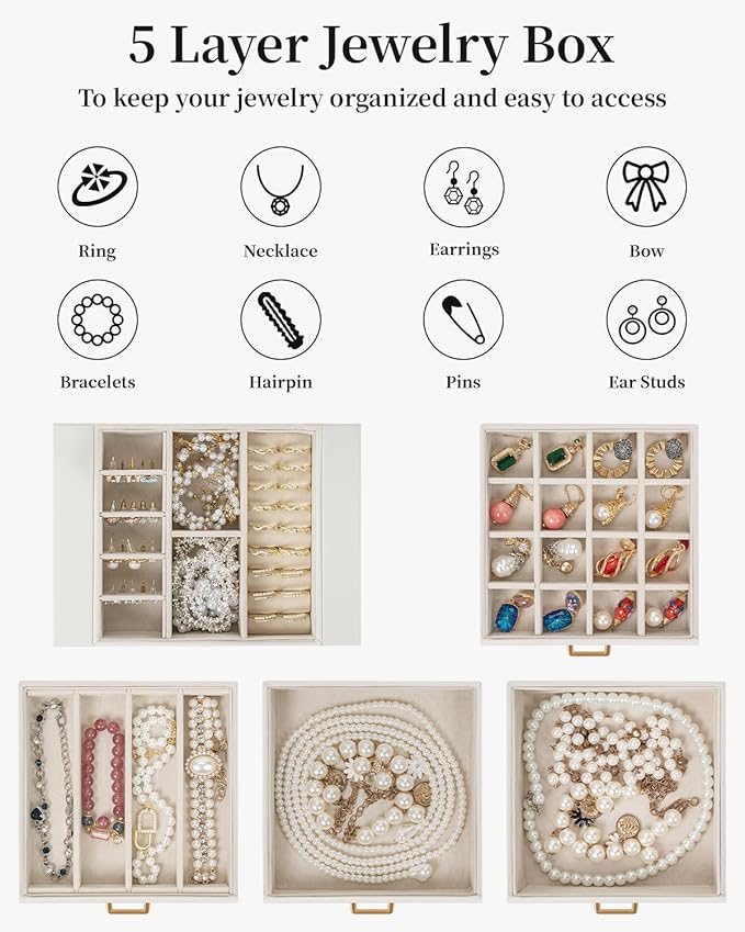 - 5 Layers, Large Capacity: This jewelry box with mirror has different storage space, 3 drawers, you can classify all jewelry and put them neatly. Such as rings, bracelets, earrings, brooches and other jewelry