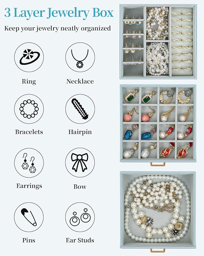 - 3 Layers, Large Capacity: This jewelry box with mirror has different storage space, 2 drawers, you can classify all jewelry and put them neatly. Such as rings, bracelets, earrings, brooches and other jewelry