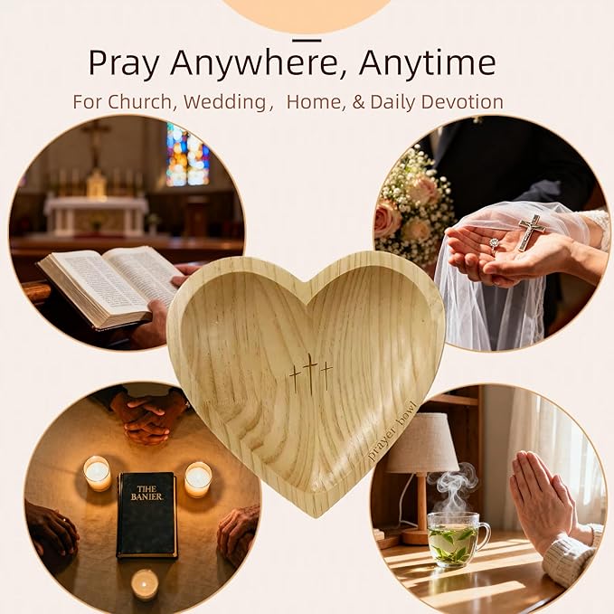 Heart Prayer Bowl with 24 Cards - Christian Heart Shaped Wooden Dough Bowl for Baptism, Handcrafted Religious Gift for Thanksgiving/Christmas/Wedding/Easter, Home Decor Accessory