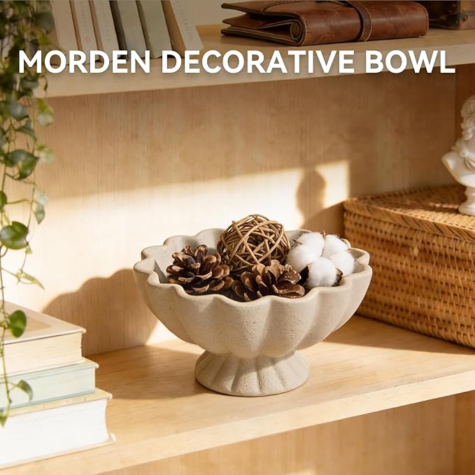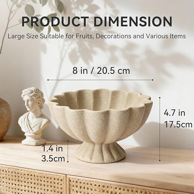 Pedestal Decorative Bowl Home Decor - Morden Resin Handmade Decorative Fruit Bowl for Kitchen Counter, Chic Ruffle Bowl Centerpiece Decor for Dining Table Coffee Table (Artificial Stone Beige)