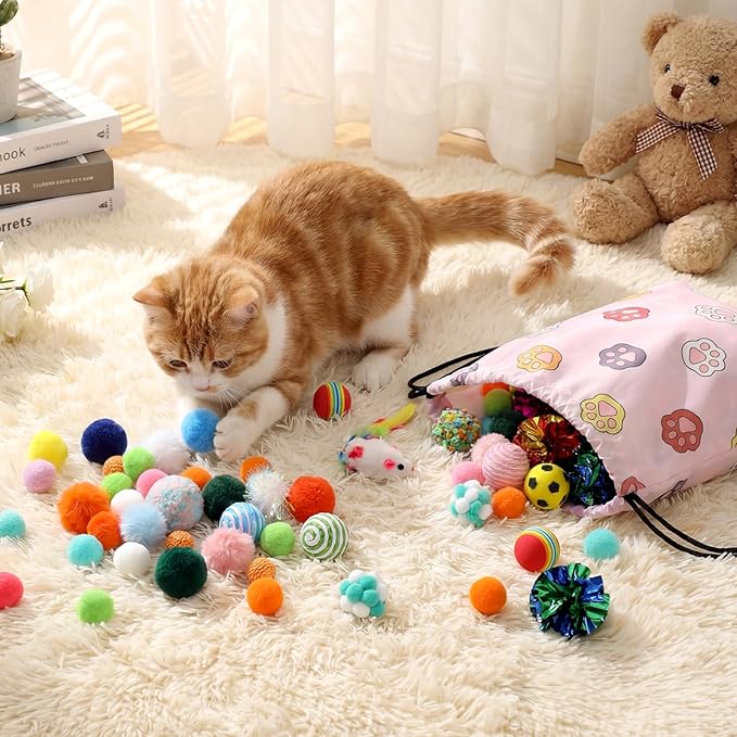 - Product Details: our Interactive Cat Toys Set Includes 1pcs cat paw gift bag and 100pcs cat's favorite ball toys in a variety of styles, such as twine balls, rainbow balls, bell balls, bell tumbler balls, 2cat crinkle balls so on; The size of bag is 13.78" x 9.84"; However, please need to note that the color of the toys may differ from the picture as we regularly update the colors of the included toys