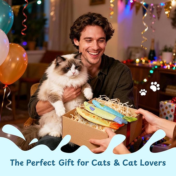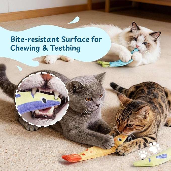 - [Soft, Bite-Resistant Surface for Chewing & Teething] - Made with soft, durable material that’s perfect for chewing, these fish toys are ideal for kittens and adult cats alike. The bite-resistant surface is gentle on their teeth and gums, helping to alleviate teething discomfort while providing hours of safe play. Designed to last through all of your cat’s chewing, kicking, and pawing