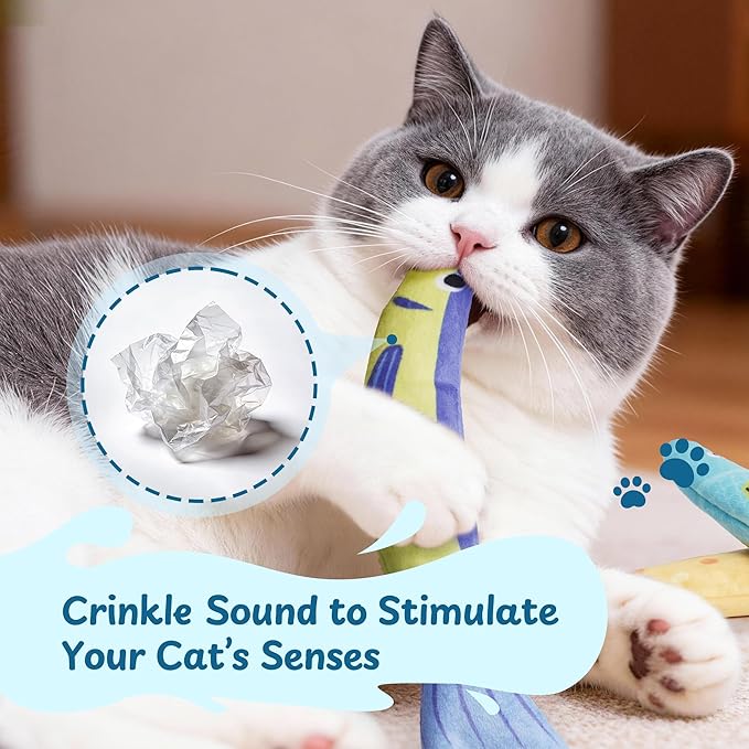 - [Crinkle Sound & Fun Textures to Stimulate Your Cat’s Senses] - These crinkle-filled floppy fish are equipped with a sound that excites your cat’s natural hunting instincts. The crinkle texture combined with the soft cotton-free surface makes every play session more engaging, encouraging your cat to bat, chew, and chase. A fun, interactive toy that adds excitement to your cat’s day